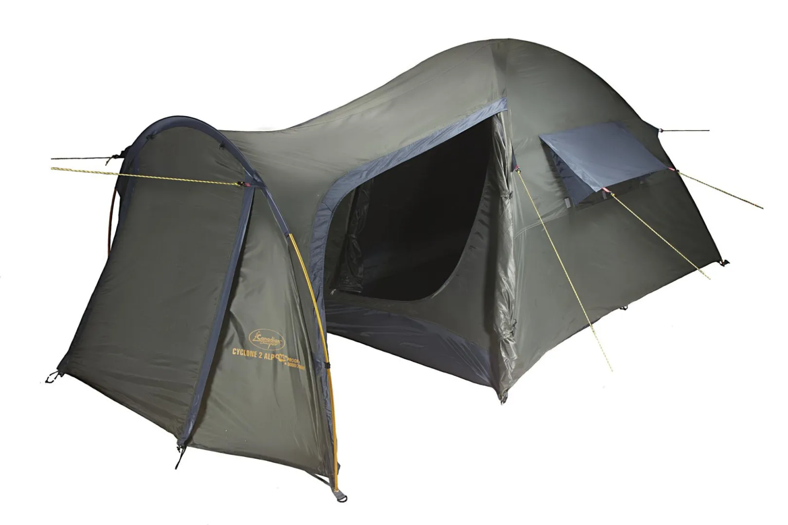 Canadian Camper CYCLONE 2 Al — это просторная двухместная палатка с большим тамбуром, который держится на третьей выносной дуге. В тамбуре два входа, а в самой палатке увеличенные вентиляционные окна. Каркас — алюминиевый, лёгкий и прочный. Ткань имеет огнеупорную пропитку, которая снижает риск возгорания при случайном контакте с нагревательными приборами (но при длительном воздействии может воспламениться).
